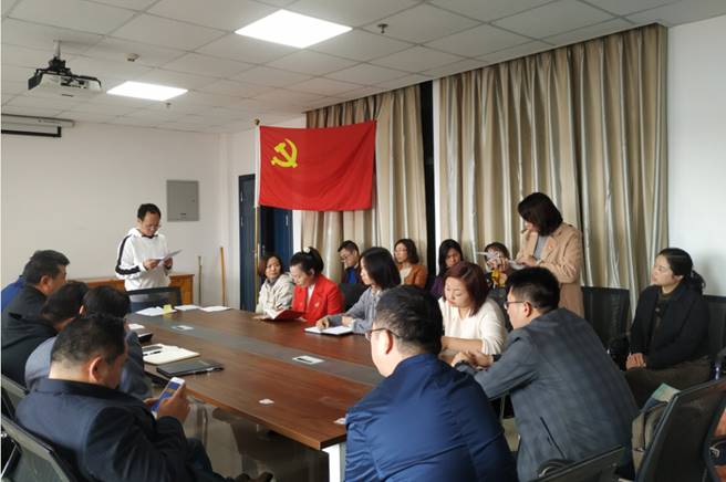 会后,以支部为单位开展了10月支部主题党日活动。全体党员重温了入党誓词,诵读了党章第六章和《习近平关于“不忘初心、牢记使命”论述摘编》的部分内容,学习了张富清、邹倩、黄大年、李保国、钟扬等同志的先进事迹。最后,党支部书记就党员对照党章、准则和条例以及群众意见建议找差距作了安排,开展了讨论。